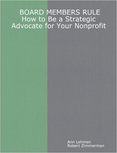 Zimmerman and Lehman, authors of Boards That Love Fundraising, have written a new and accessible hands-on book, Board Members Rule, based on their experience in working with boards and nonprofits for many years. Board Members Rule reframes a board member's role to be a strategic advocate for your nonprofit and its constituency. Given the heightened awareness of accountability and transparency, Board Members Rule shows how to pay attention to both while furthering your values, mission and vision and promoting pragmatic, effective and efficient strategies. Geared for new and seasoned board members, it answers questions such as: